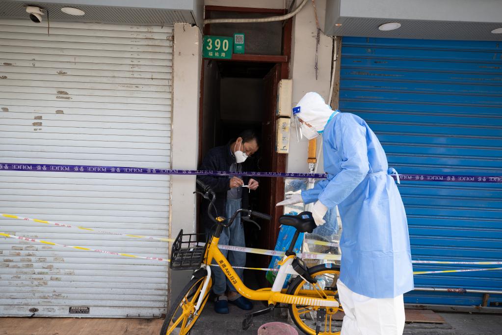 “太好了,都是‘一道杠’。”广福居委会干部俞静芳上楼发放抗原检测试剂,指导他们做完检测,出来后舒了口气,面罩上都是水汽。新华社记者 金立旺 摄