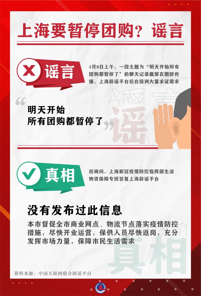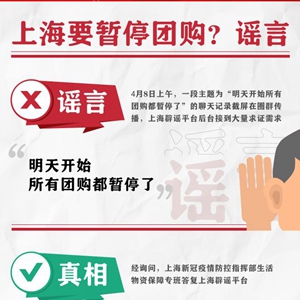 据上海网络辟谣平台消息:4月8日上午,一段主题为“明天开始所有团购都暂停了”的聊天记录截屏在圈群传播,上海辟谣平台后台接到大量求证需求。