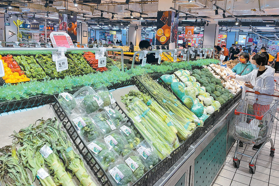 昨天(11日)傍晚,在物美大卖场玉蜓桥店,蔬菜、肉类、面包等生活必需品种类丰富、供应充足。 记者 邓伟摄