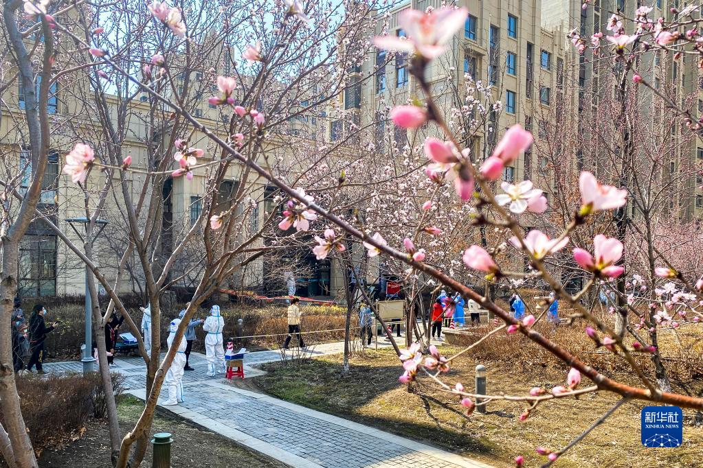 4月14日,在长春市一处管控小区,居民有序排队接受核酸采样。 新华社记者 许畅 摄