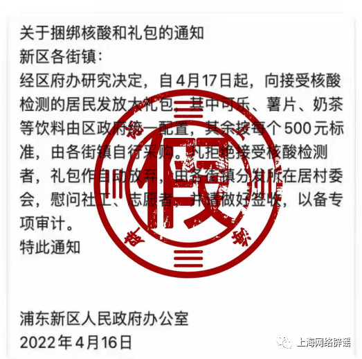 今日(17日),圈群流传一条“关于捆绑核酸和礼包的通知”消息,称浦东新区人民政府将向接受核酸检测的居民发放大礼包。消息中提到,礼包为500元标准,包含可乐、薯片、奶茶等,拒绝接受核酸检测着将视为自动放弃礼包。
