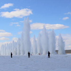 在爆破员的指令下,伴着巨响,一道道夹着冰的水柱瞬时冲上几十米高的天空,浩浩荡荡的气势仿佛万马奔腾,冰封的江面与天空霎时模糊了边界……这是黑龙江干流漠河段在进行防凌破冰。