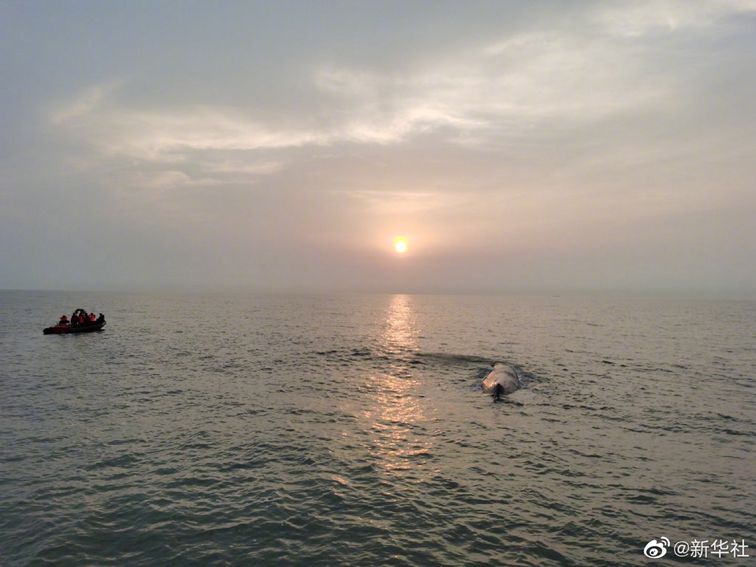 4月19日上午,一头鲸鱼在浙江省宁波市象山县附近海域搁浅。20日清晨,经当地救援力量牵引至放生区域后,这头体型较大的鲸鱼已自主下潜、游回大海。(记者顾小立、张璇,图片由象山县提供)