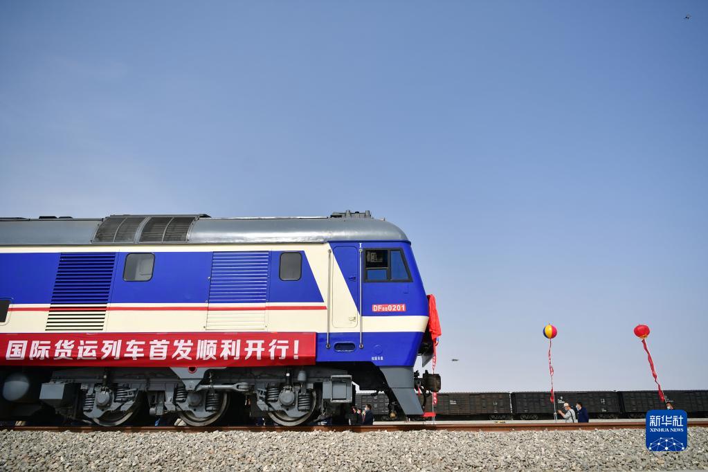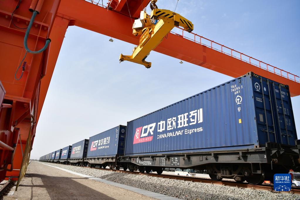 4月21日,甘肃首趟中老铁路国际货运列车在敦煌市铁路西货站综合货场等待发车。 新华社记者 陈斌 摄