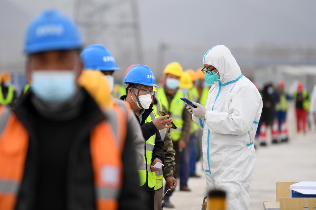 4月16日,西宁南川工业园区一项目建设现场,工人们排队进行核酸采样。(新华社记者 范培珅 摄)