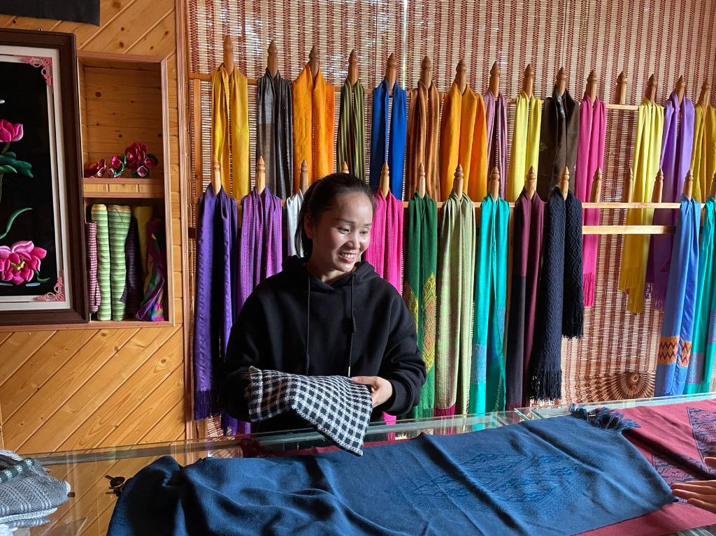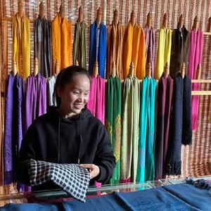 走进雷山县铜鼓广场旁的锦鸡绣业有限公司门店,带有苗族刺绣的小方巾、有织锦图案装饰的围巾、“小清新”风格的刺绣帆布包映入眼帘。和其他民族服饰店不同,这个店里的产品显得格外“洋气”。