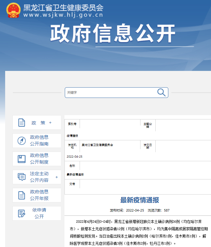 2022年4月24日0-24时,黑龙江省新增新冠肺炎本土确诊病例26例(均在哈尔滨市),新增本土无症状感染者12例(均在哈尔滨市),均为集中隔离或居家隔离管控期间核酸检测发现。当日治愈出院本土确诊病例2例(哈尔滨市1例,佳木斯市1例),解除医学观察本土无症状感染者3例(佳木斯市2例,牡丹江市1例)。