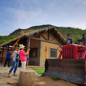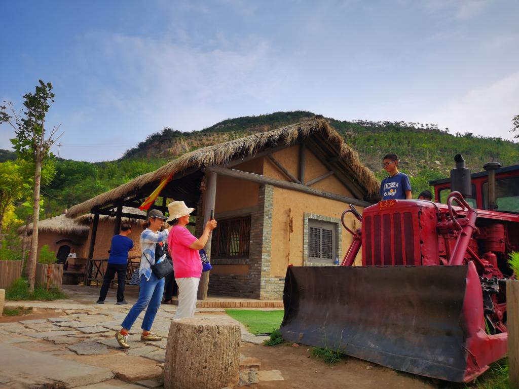 小西沟的一角布置了农业主题展览,游客在推土机前留影。新华社记者李紫薇 摄