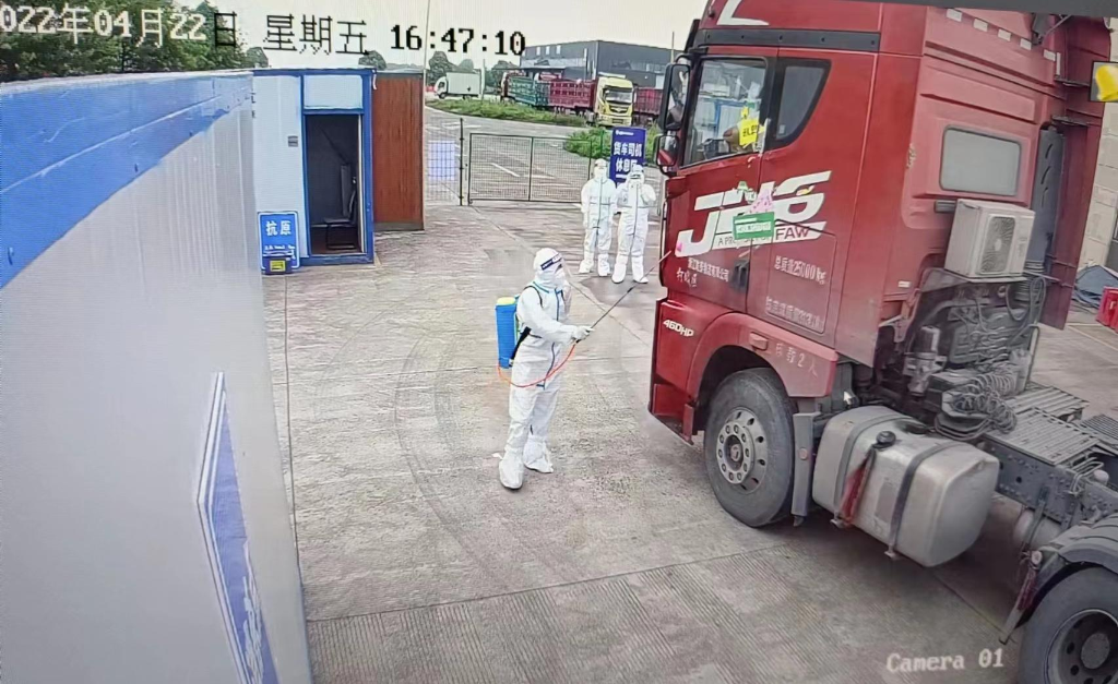 这是衢州传化公路港防疫服务站监控截图。工作人员正在对车辆重点区域消杀。(图片由受访者提供)