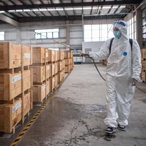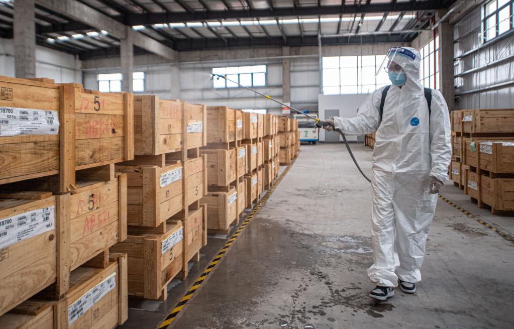 4月13日,杭州传化公路港的工作人员对仓库内存放的进口货物进行消杀。 新华社记者 江汉 摄
