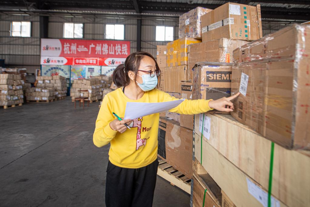 4月13日,杭州传化公路港内的物流公司仓管员在清点货物,准备装车发货。新华社记者 江汉 摄