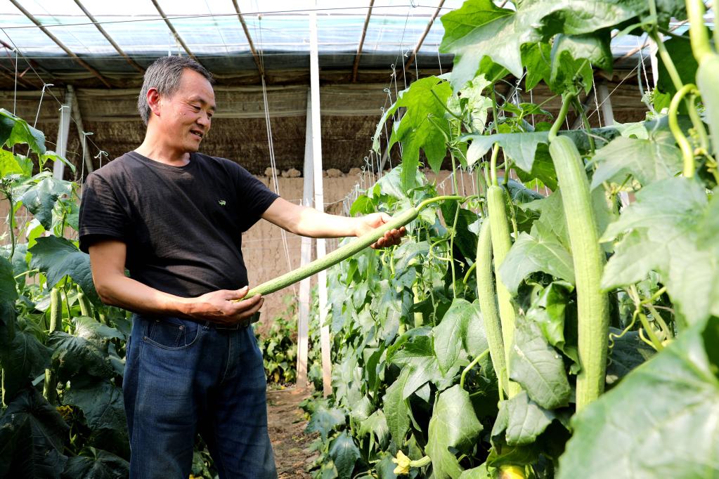 高青县黑里寨镇菜农在看丝瓜长势。受访者供图