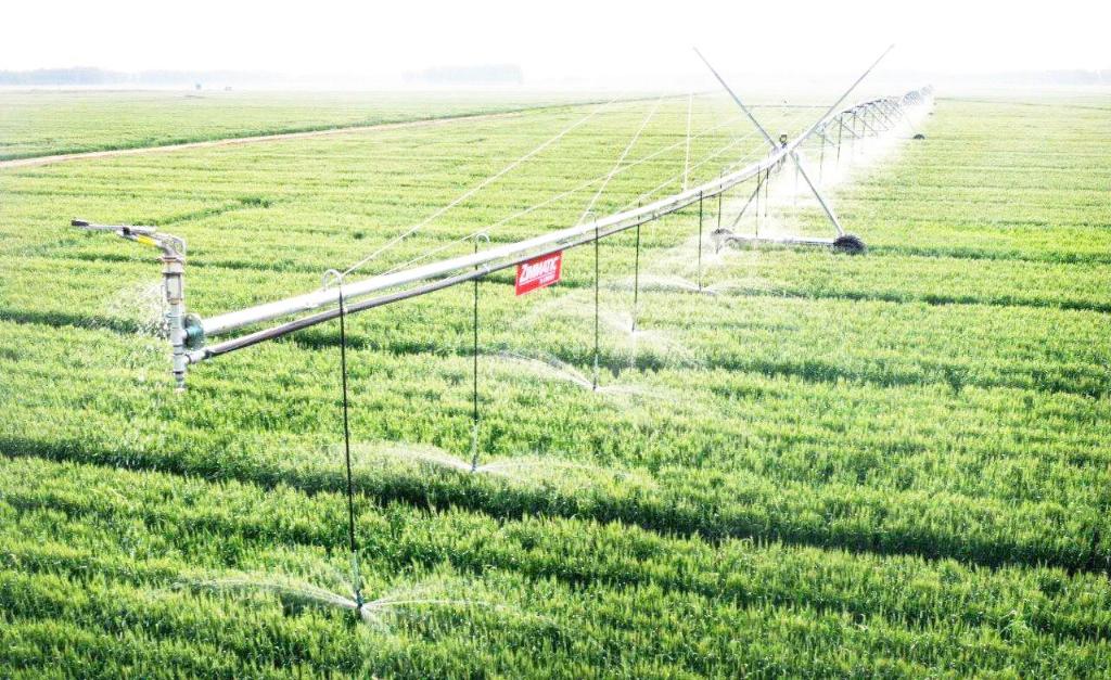 自走式指针喷灌机正在“211”种养循环生态农场的麦田里工作。受访者供图