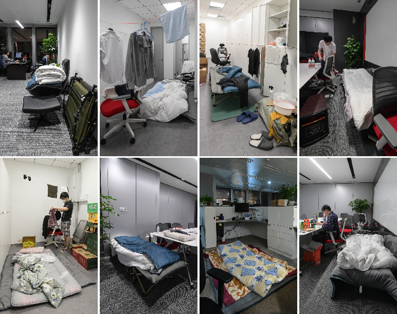 ↑这是记者在封闭管理期间拍摄的工商银行上海分行金融市场部坚守岗位的部分员工的住处。员工们将会议室、更衣间临时改成单人宿舍用于休息(拼版照片,4月14日摄)。