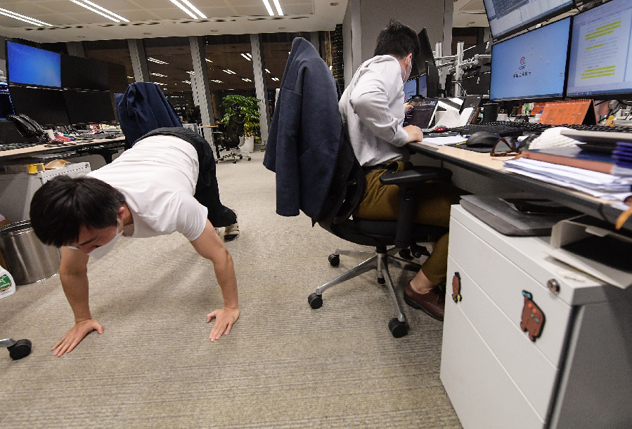 ↑4月14日,工商银行上海分行金融市场部市场营销科科长黄硕喆(左)在空闲时做起了俯卧撑。