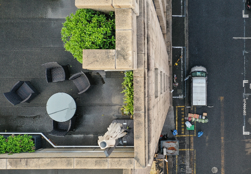 ↑4月21日,在后勤服务小组指挥下,工作人员在位于上海外滩的中国银行上海市分行营业部入口处对配送的生活物资进行消杀。