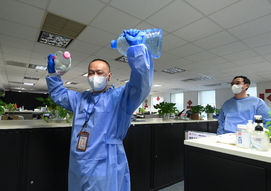 ↑后勤保障小组成员薛锋以5升装的桶装水作为自己锻炼的“器械”(4月20日摄)。