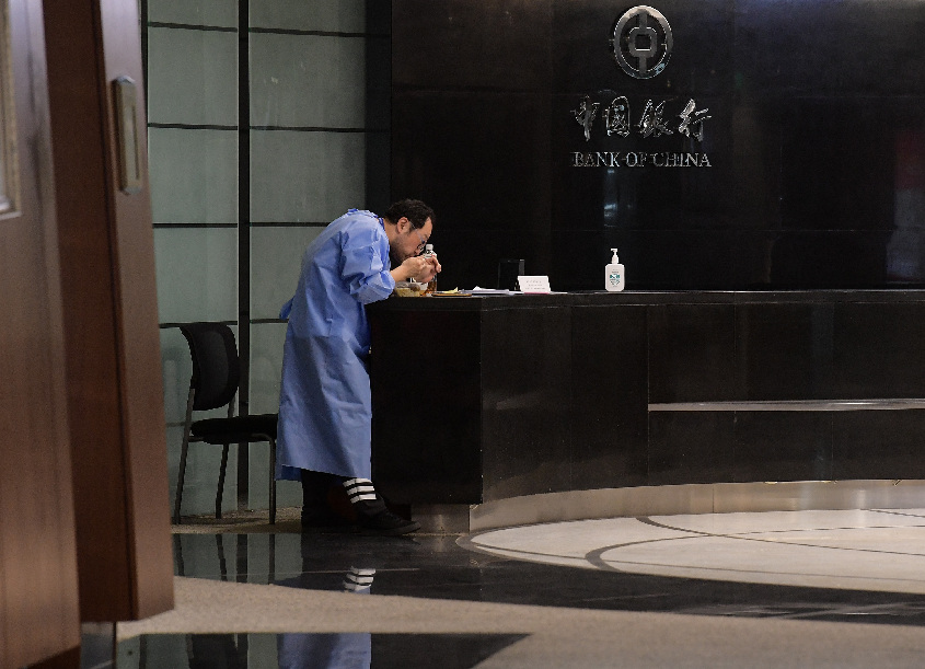 ↑中国银行上海市分行后勤服务中心主管韩皓在大楼内一处空旷的位置吃午饭(4月20日摄)。