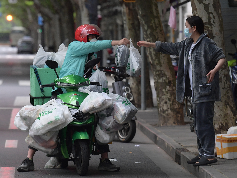 ↑一位快递小哥在上海市黄浦区兴安路为居民送货(4月28日摄)。