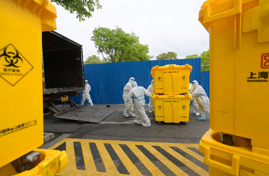 ↑4月30日,上海环境集团工作人员在上海市仁济医院南院区(新冠定点医院)收集医废。