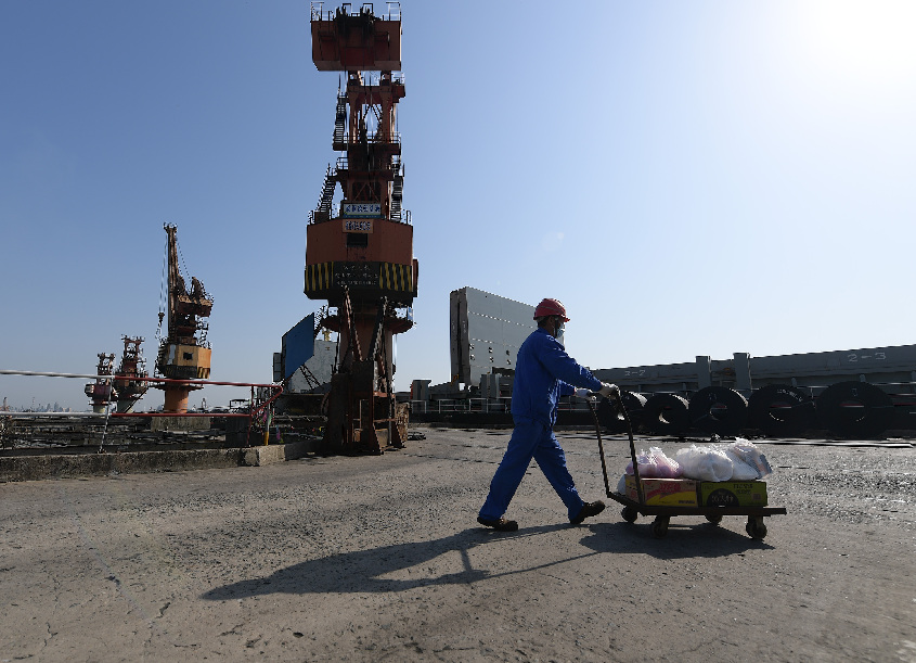 ↑4月11日,杨浦区海保码头工作人员在作业区帮忙转运订单货物。当日,因封控措施被困码头的船主张同华向商家订购了食物,但因为码头的防疫规定无法交接,了解情况后,码头管理者与配送人员接力,将订单货物送到张同华手中。