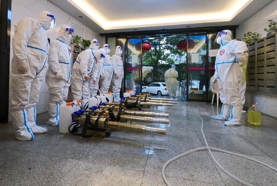 ↑4月13日,驰援上海的兰州山河救援志愿服务队来到黄浦区疫情严重的多个小区,对居民楼进行消杀。
