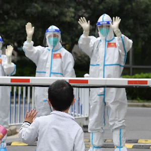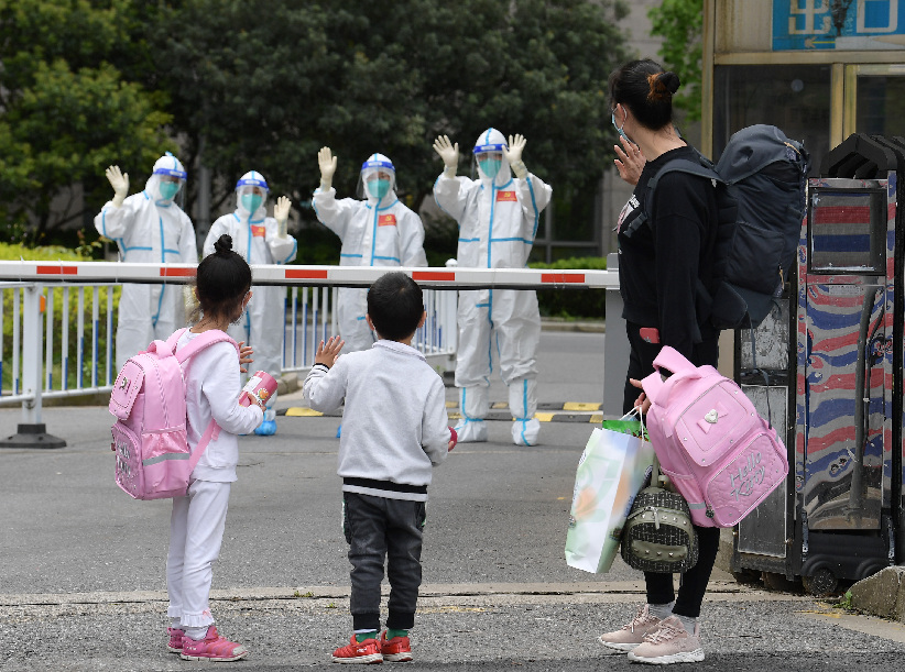 ↑4月30日,走出医院准备回家时,小华(前中)和姐姐、妈妈(右一)一起回身向护送他们出院的医护人员挥手道别。当日,由上海交通大学医学院附属仁济医院南部院区(新冠定点医院)收治的3岁重症新冠患者小华(化名)出院。