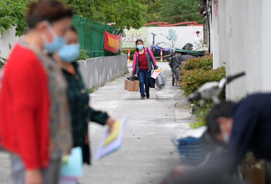 ↑4月24日,由方舱医院返回的村民王女士走入村中家门口的小路。当日起,上海市浦东新区北蔡镇联勤村村民陆续从隔离点回家。