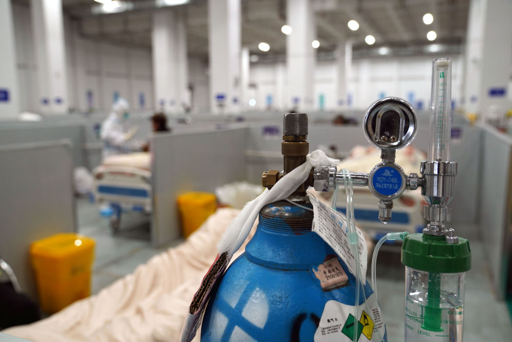 ↑4月23日在上海临港方舱医院拍摄的升级改造床位配备的氧气瓶。