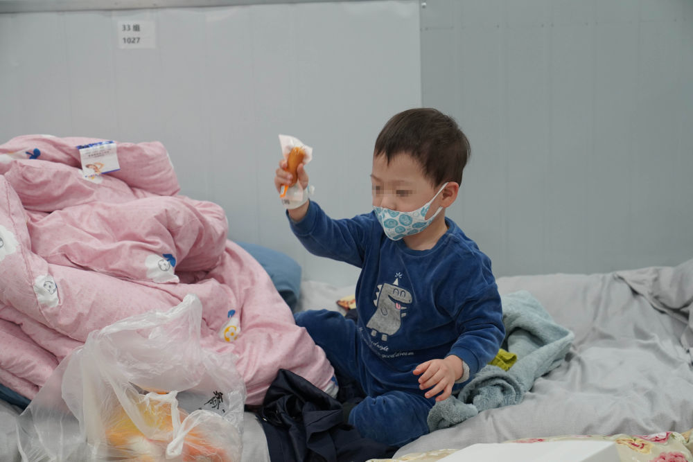 ↑4月25日,一名儿童患者在方舱医院内玩耍。