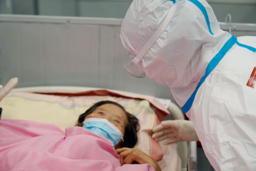 ↑4月21日,临港方舱医院的医护人员帮患者测量血氧饱和度。