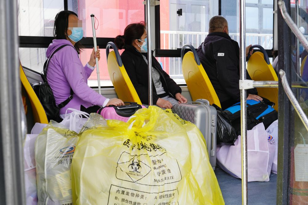 ↑4月30日,康复出舱人员离开上海临港方舱医院,乘坐转运车辆返回居住地接受健康监测。