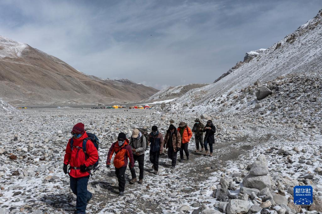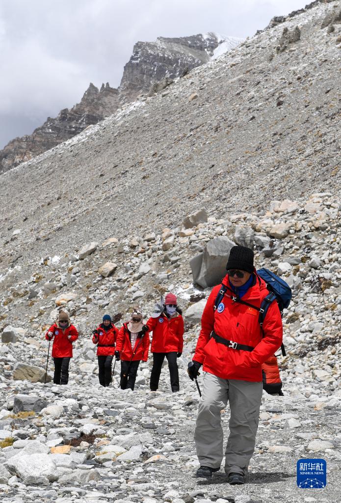 朱彤(右一)和科研人员在珠峰大本营和东绒布冰川间徒步穿梭(5月1日摄)。新华社记者 姜帆 摄