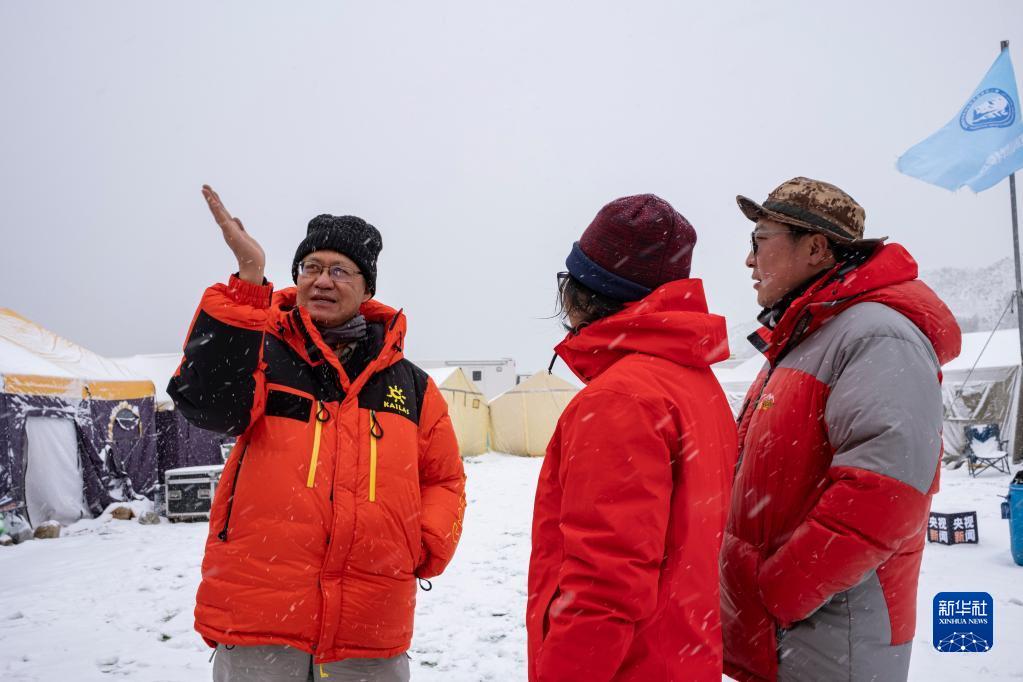 在珠峰登山大本营,朱彤(左)和科研人员交流(4月30日摄)。新华社记者 孙非 摄