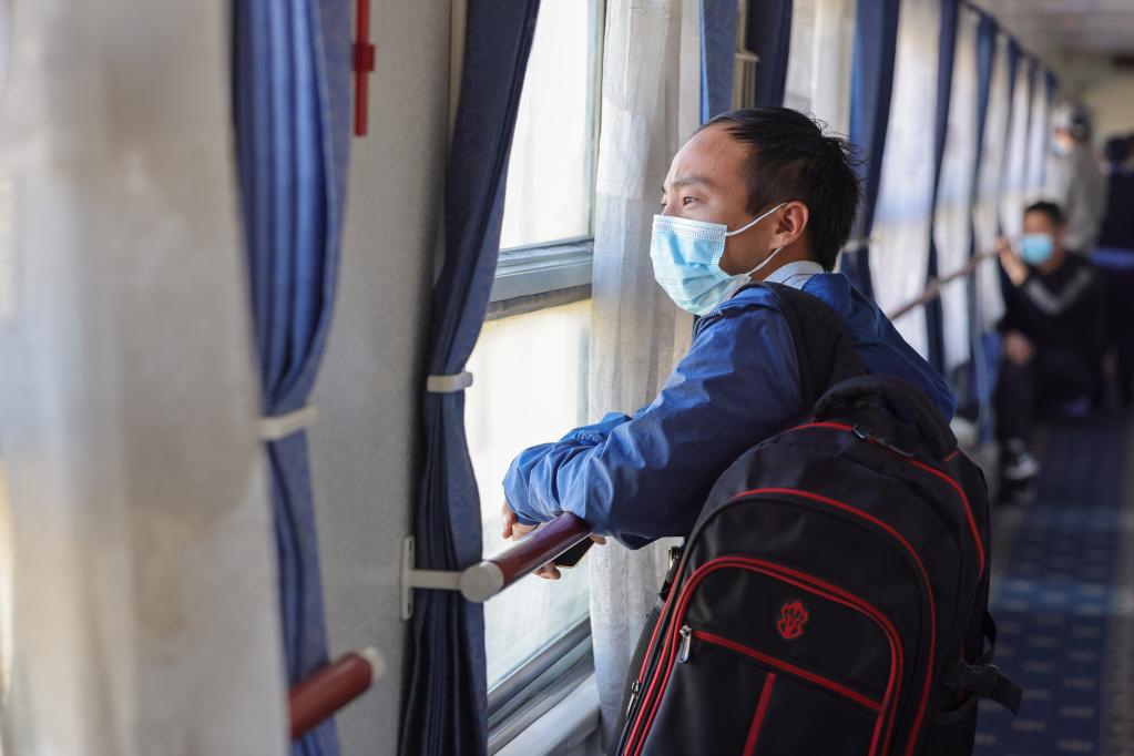 在和田开往乌鲁木齐的“和田玉龙号”列车上,乘客欣赏沿途风景(4月29日摄)。新华社记者丁磊 摄