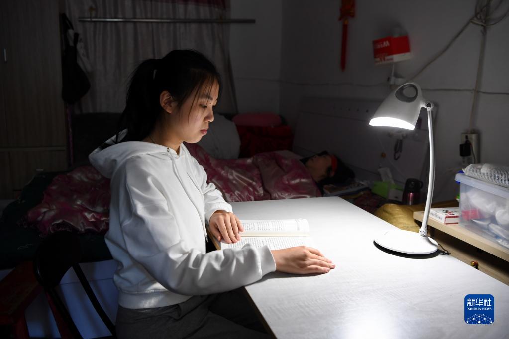 5月3日,在福州一处出租屋内,王林慧在母亲入睡后,学习护理学专升本教材,准备自考本科。新华社记者姜克红摄