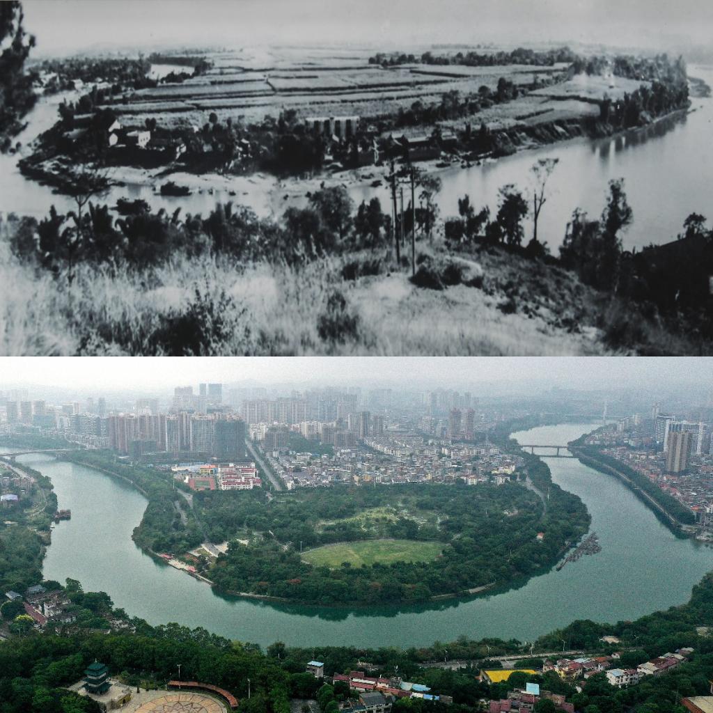 拼图照片,上图为1981年时百色市面貌(资料图片,百色市档案馆提供);下图为同一地点现在的百色市面貌(5月8日摄,无人机照片)。