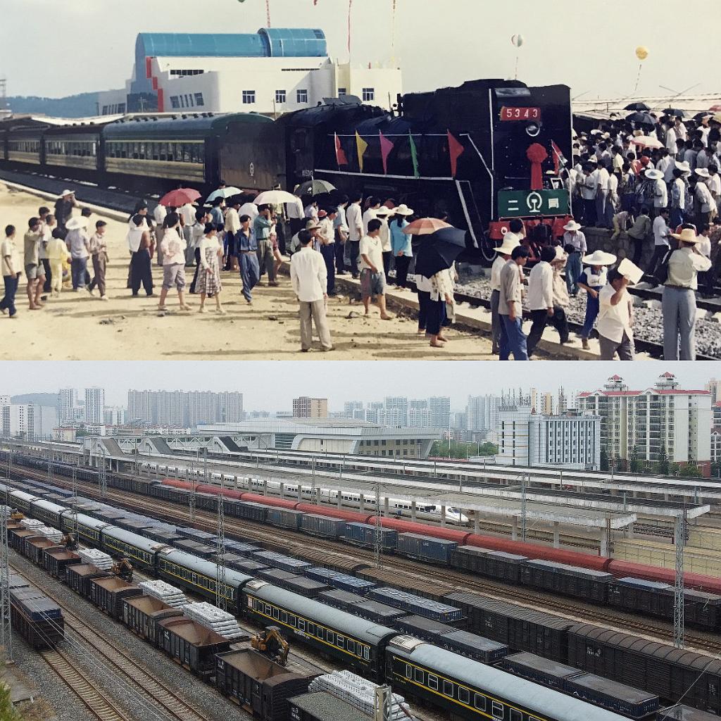 拼图照片,上图为1995年国庆节一列火车开进百色市火车站(资料图片,中国铁路南宁局集团有限公司提供);下图为现在的百色市火车站客货列运行景观(5月8日摄,无人机照片)。新华社记者张爱林摄