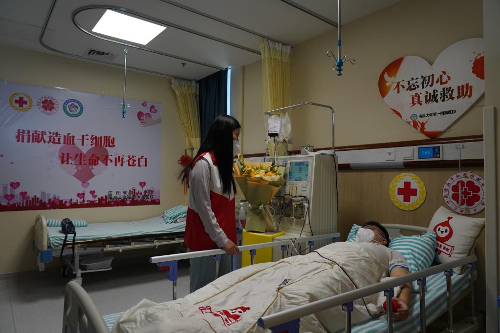 5月6日,在南昌大学第一附属医院象湖院区的一个“特殊”房间里,来自江西湖口的造血干细胞捐献志愿者张浩林正躺在病床上进行造血干细胞采集。在他右侧,运转着的采集机将红色的血液从他体内抽出又输回;在他左侧,已于2020年成功配型并捐献造血干细胞的夏晓雯,作为红十字志愿者陪伴在他身边。