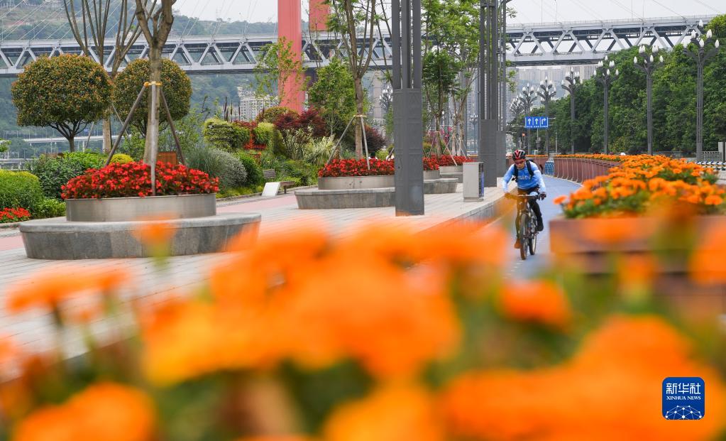 市民在重庆市江北区北滨路漫行步道的自行车道上骑行(4月29日摄)。新华社记者 王全超 摄