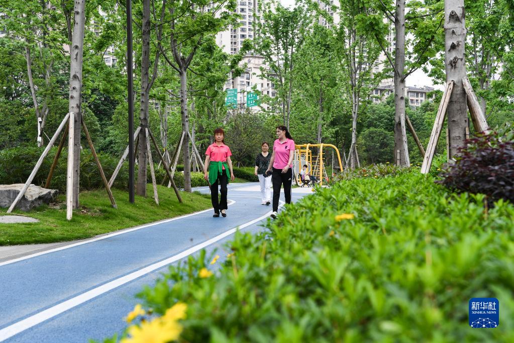居民在重庆江北区石子山社区体育文化公园散步(4月29日摄)。新华社记者 王全超 摄