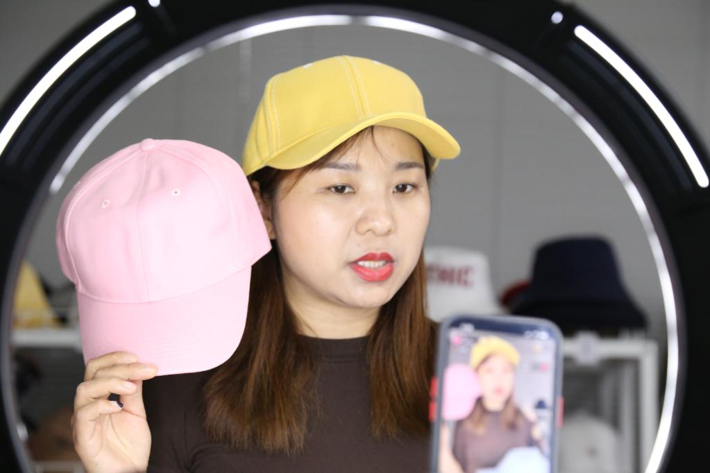 河南淮阳瑞能服帽直播带货间。(新华社发)