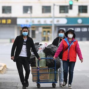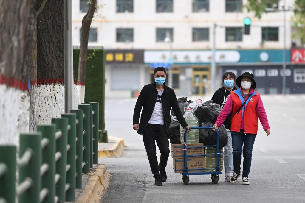 5月10日,在青海省西宁市城中区南山东社区,社区工作人员在运送防疫物资。(新华社记者 张龙 摄)