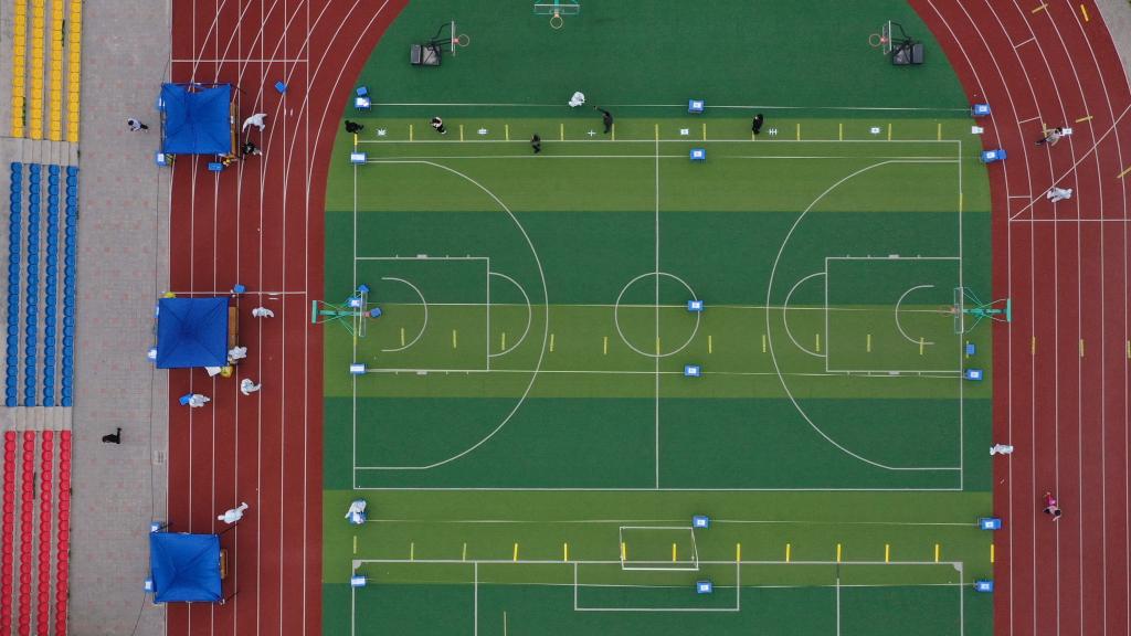 5月10日,在青海省西宁市城西区文汇小学核酸采样点,市民在排队进行核酸采样(无人机照片)。(新华社记者 张龙 摄)