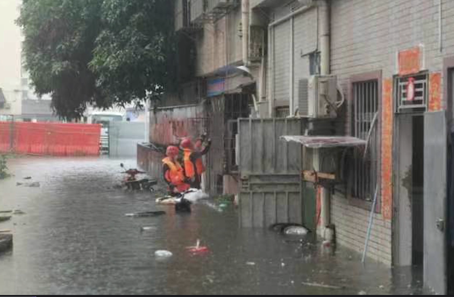 在深圳宝安区固戍海滨新村,水深没过膝盖,两名大人和两个小孩被困楼内。消防救援人员使用工具对一楼阳台栏杆进行破拆,随后利用救生圈成功将被困人员转移至安全区域。
