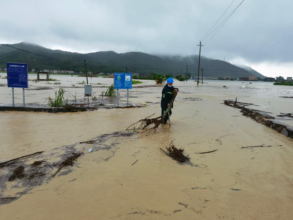 12日,台山长海桥水位超出公路,防汛干部清理杂物。(受访者供图)