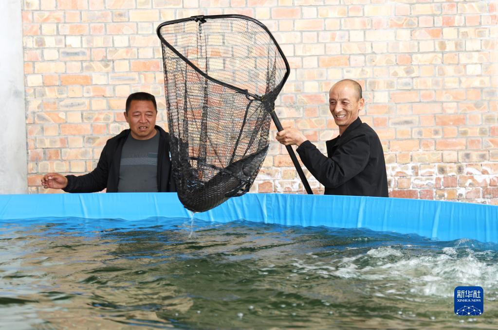 宁夏固原市原州区姚磨村种植大户姚选(右)在“种养结合”大棚里捞鱼(4月19日摄)。新华社记者 卢鹰 摄