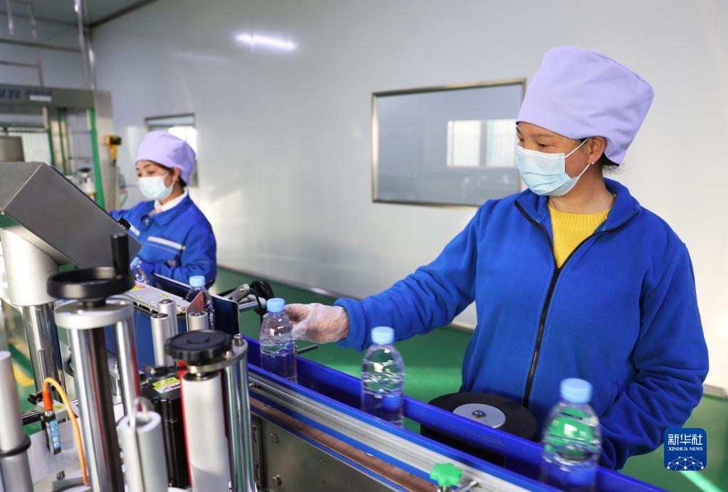 宁夏固原市泾源县腾筠源饮品有限公司的工人在饮用水生产线上工作(4月20日摄)。该公司获得用水权确权1.97万方,以水定产的约束让公司时刻紧绷节约用水意识。新华社记者 卢鹰 摄