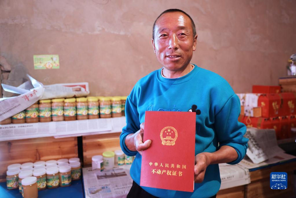 宁夏固原市彭阳县米塬村蜂农米克宗展示山林权不动产权证书(4月20日摄)。新华社记者 卢鹰 摄
