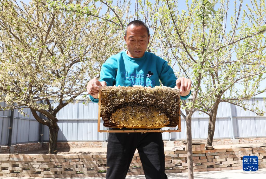 宁夏固原市彭阳县米塬村蜂农米克宗在观察自家养殖的蜜蜂(4月20日摄)。新华社记者 卢鹰 摄
